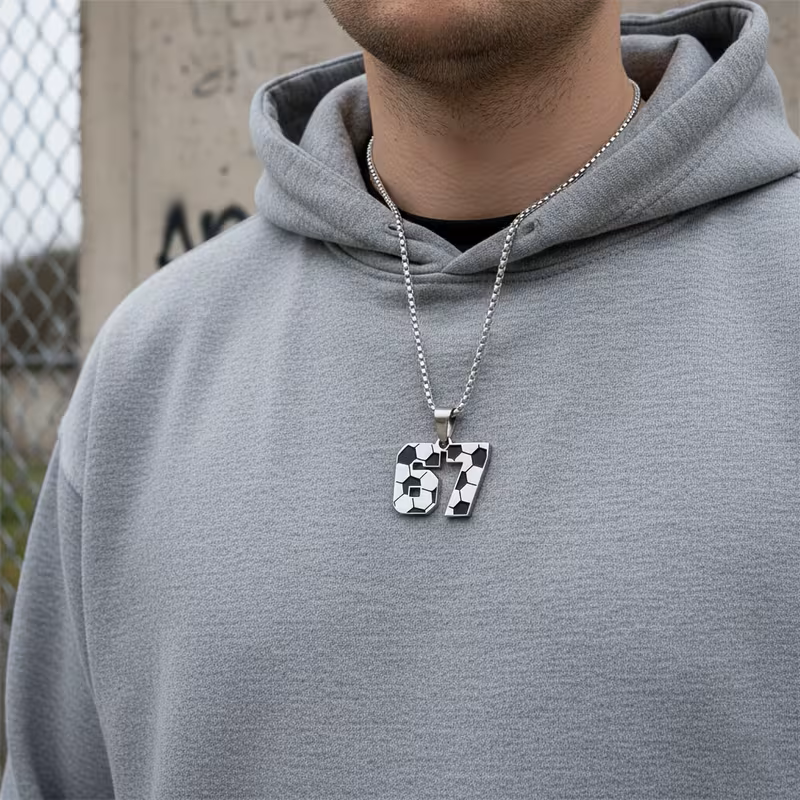 A cool #67 Soccer Necklace with an 18″ heavy duty chain. Zinc alloy charm.